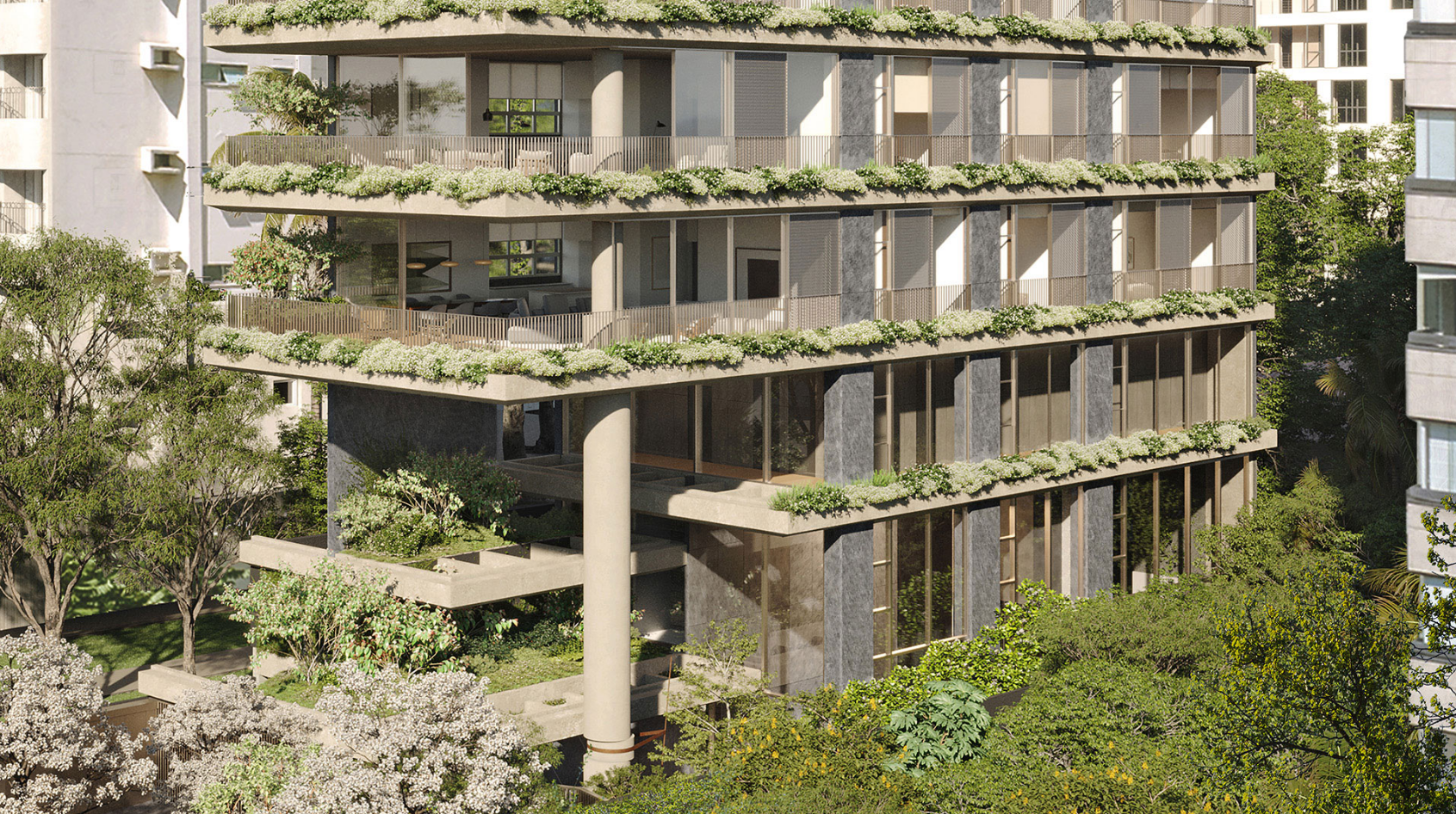Com unidades que atingem aproximadamente 310 m², o edifício oferece plantas amplas e bem resolvidas, com três ou quatro suítes e integração plena das áreas sociais. As generosas superfícies envidraçadas favorecem a entrada de luz natural e ampliam a relação entre os ambientes internos e os terraços, enquanto o pé-direito elevado intensifica a percepção de espaço e sofisticação. A linguagem arquitetônica aposta em linhas limpas, materiais nobres e soluções estéticas atemporais, alinhadas ao padrão elevado da região.